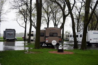 Last night Concetta looked up the rain prediction for Onawa, Iowa, were we had camped for two days, and we both were dismayed at the results. The prediction was for an 80% chance of heavy rain, perhaps progressing to a 90% chance. Already many of the campers around us needed a canoe to get to their RV doors (photo left and below right). From the distance we could see that the lake beside which we were parked had come up so far that it seemed to be threatening the nearby, low-lying cabins.